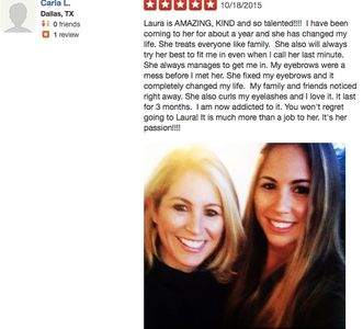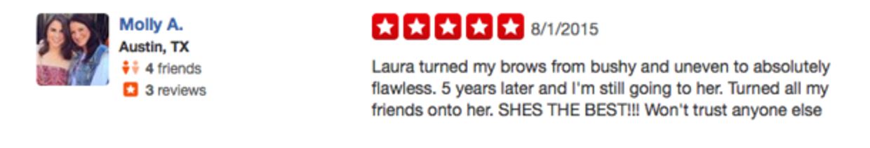 I have always had a difficult time finding someone who knows how to shape my brows. I have very dark, thick eyebrows that stand out and what Laura did with them was amazing. When Laura shapes your brows you really get to see their full potential and I always get comments on how nice they look. Kayla S.