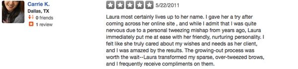 Laura most certainly lives up to her name. I gave her a try after coming across her online site , and while I admit that I was quite nervous due to a personal tweezing mishap from years ago, Laura immediately put me at ease with her friendly, nurturing personality. I felt like she truly cared about my wishes and needs as her client, and I was amazed by the results. The growing-out process was worth the wait--Laura transformed my sparse, over-tweezed brows, and I frequently receive compliments on them.