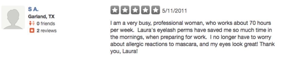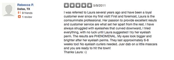 I was referred to Laura several years ago and have been a loyal customer ever since my first visit! First and foremost, Laura is the consummate professional. Her passion to provide excellent results and customer service are what set her apart from the rest. I have always struggled with eyelashes that curved downward, I tried everything, with no luck until Laura suggested I try her eyelash perm. The results are PHENOMENAL. My eyes look bigger and brighter after her eyelash perms. They last approximately 6-8 weeks too! No eyelash curlers needed. Just dab on a little mascara and you are ready to hit the town!