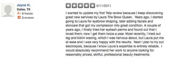 Laura not only takes care of brows - she is the best LASH GENIUS ever! Laura has been caring for my lashes for many years and I would not go more than 3-5 months without a visit to my favorite expert! Laura takes the time to get to know you, your needs, your eyes, and what works for you. She will take care of you and I promise, one visit and you will not go another summer without a lash perm from Laura!! Thank you for all you do!