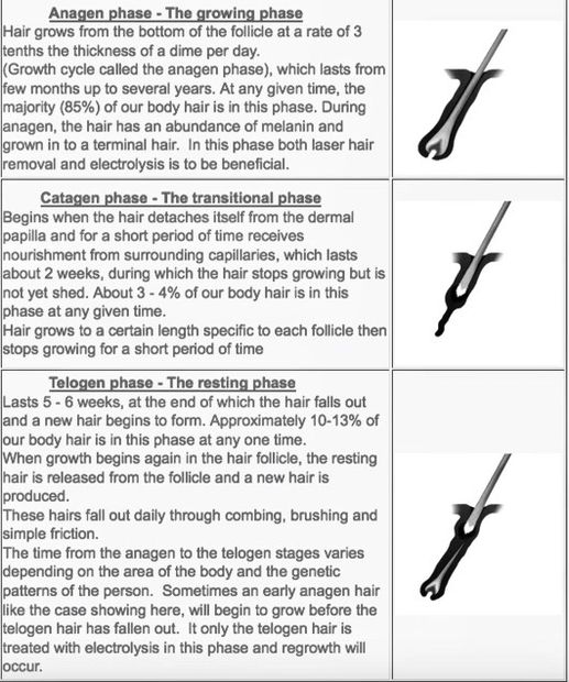 1-  Early anagen hair begins to grow before the telogen hair has fallen out, like the above example, it is only the telogen hair that is being treated with electrolysis in this phase and regrowth will occur.