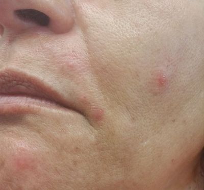 Acne, especially pimples & oily skin on the chin around the mouth, also called cystic:
